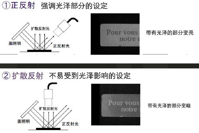 將相機設置在法線的線路上,這樣成像,工件帶有光澤的部分與正反射相比會變暗。擴散反射不易受工件光澤度影響。