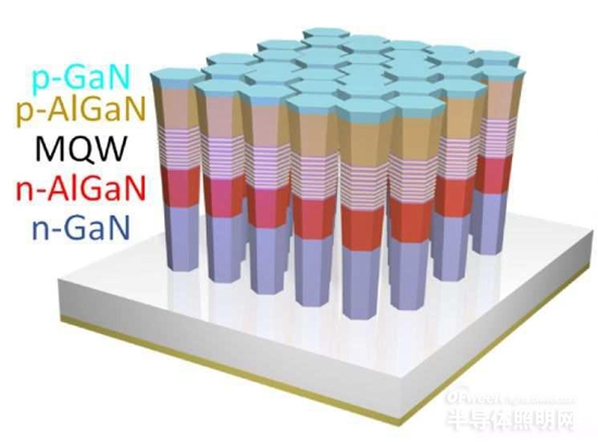 該研究的一項有趣之處在于采用鈦涂覆的低成本硅基板來生長奈米線,這不僅能讓制程變得易于擴展,還能結合鈦金屬層帶來的諸多優(yōu)勢,包括更高的UV反射、更好的熱耗散,以及改善流注入。