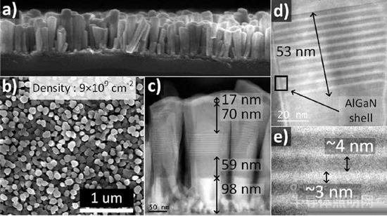 (a) 橫截面SEM圖顯示垂直排列的奈米線 (b) 在Ti / Si基底上生長的組件俯視圖顯示緊密堆積的奈米線 (c) 顯示n型AlGaN層、AlGaN/AlGaN QDisk、p型AlGaN和p-GaN層的AlGaN奈米線高角度環(huán)形暗場影像(HAADF-STEM) (d) 主動區(qū)顯示10對均勻的Qdisks形成 (e) Qdisk的放大影像顯示不同的Qdisk組成變化。